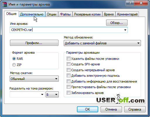 В окне «Имя и параметры архива» переходим во вкладку «Дополнительно».