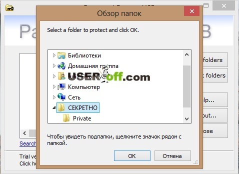 Если вы попробуете открыть папку «СЕКРЕТНО», программа не позволит этого сделать и потребует ввод пароля доступа.